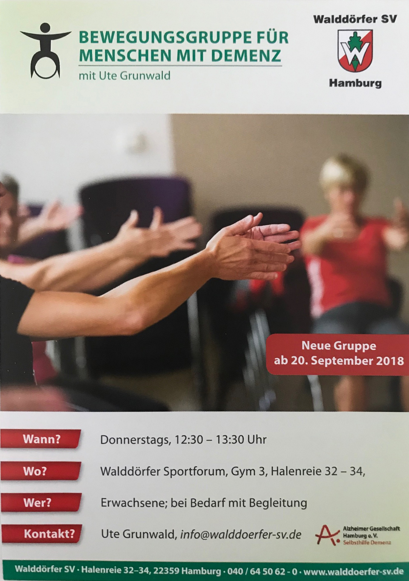 Neue Gruppe: immer Donnerstags, von 12:30 Uhr bis 13:30 Uhr im Walddörfer Sportforum, Gym 3, Halenreie 32 - 34 für Erwachsene; bei Bedarf mit BegleitungAnmeldung bei Ute Grunwald unter info@walddoerfer-sv.de